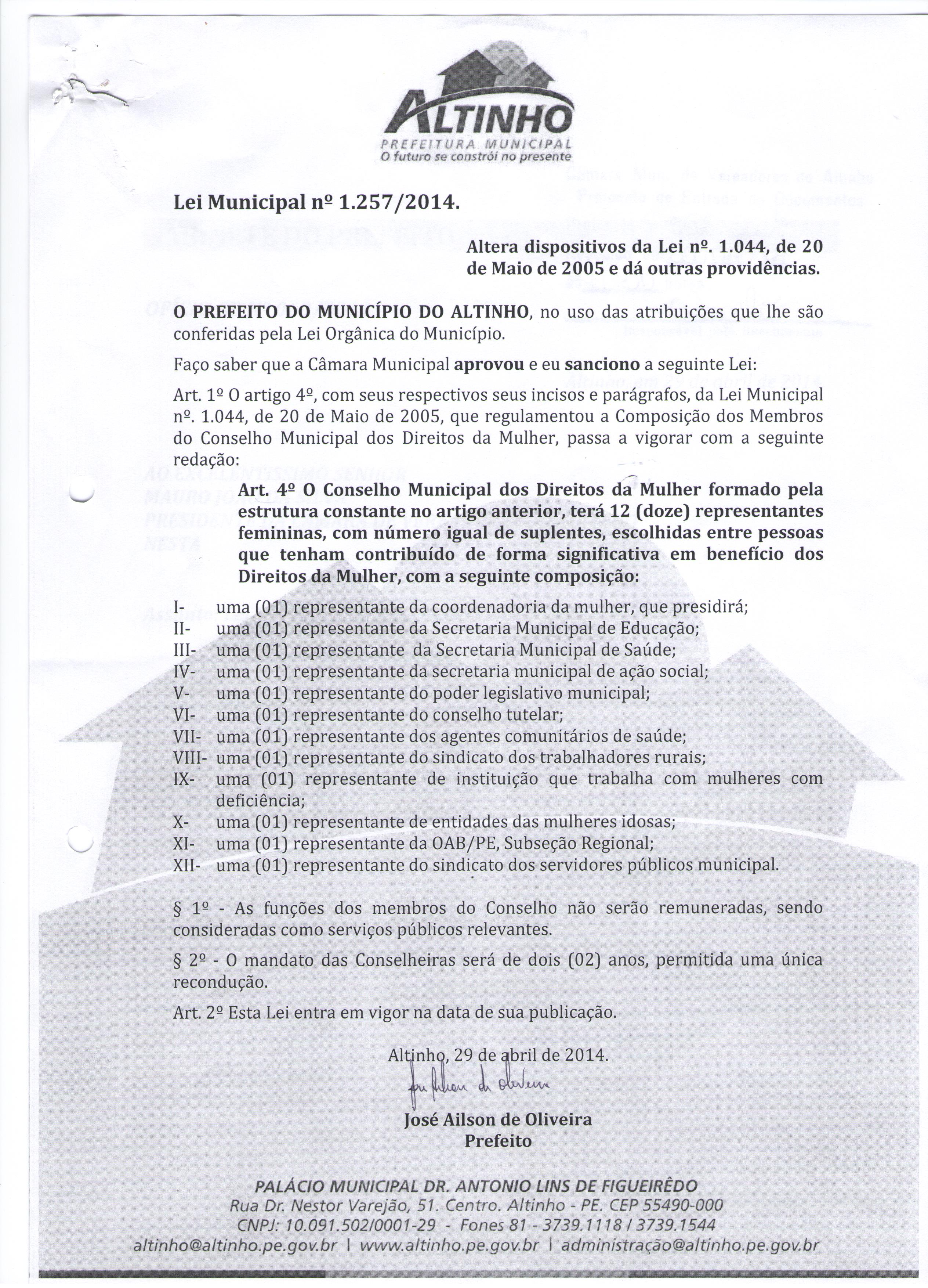 LEI COMPLEMENTAR - Introduz modificações na Lei Complementar Municipal nº 2, de 30 de março de 2009, para dispor sobre a Estruturação Orgânica da Secretária da Criança, Juventude, Trabalho, Qualificação e Empreendedorismo no âmbito do poder executivo do Altinho e dá outras providências.