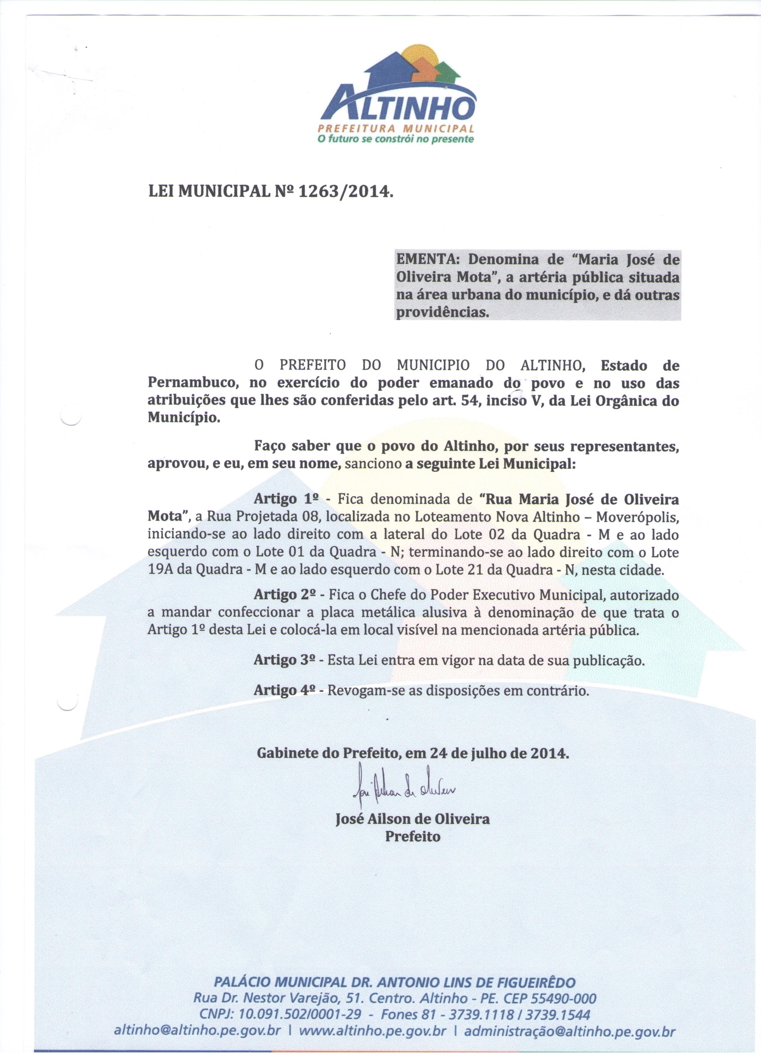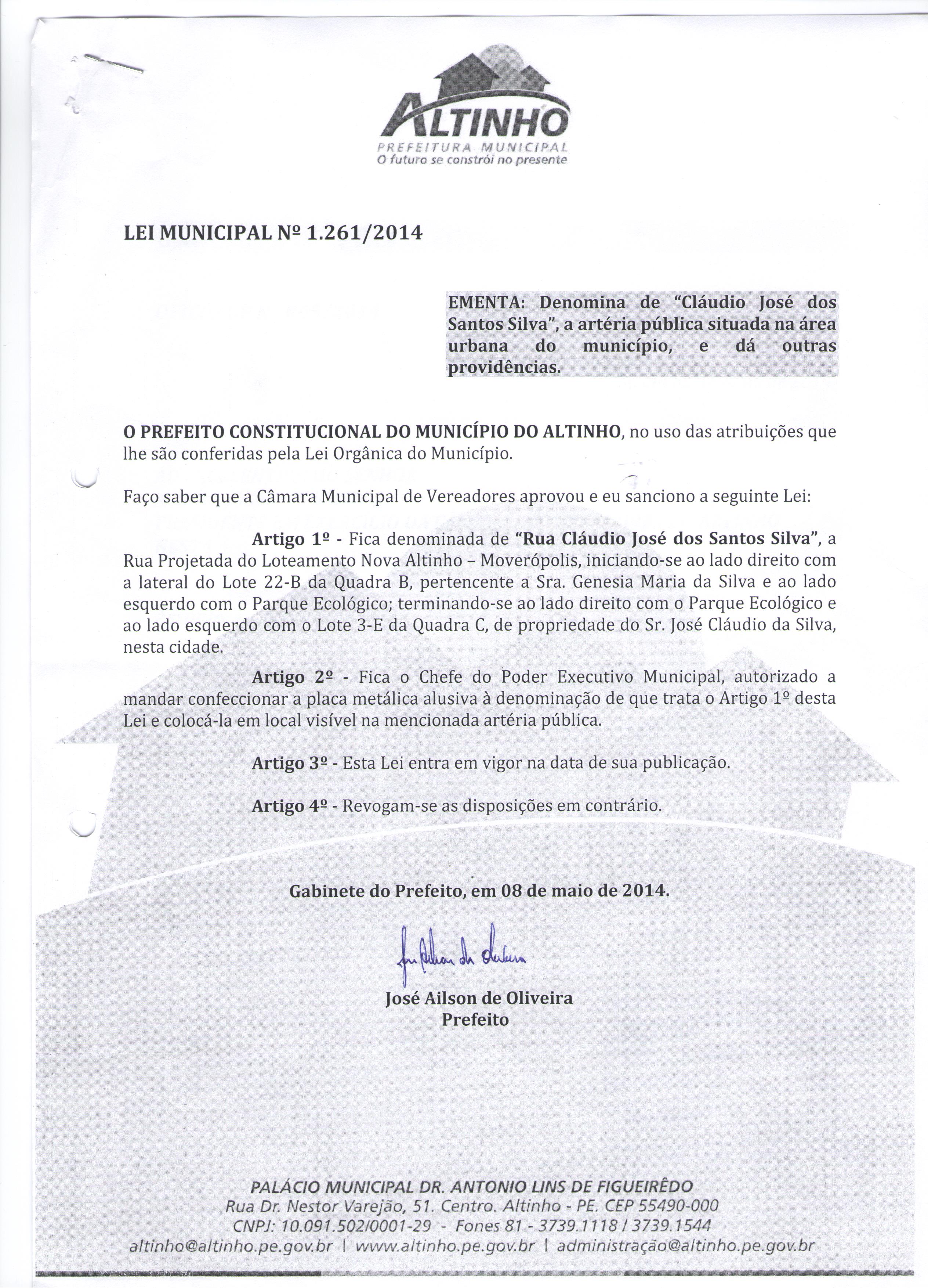 Denomina de "ALICE OLIVEIRA DA SILVA" a artéria pública situada na área urbana deste munícipio e dá outras providências.